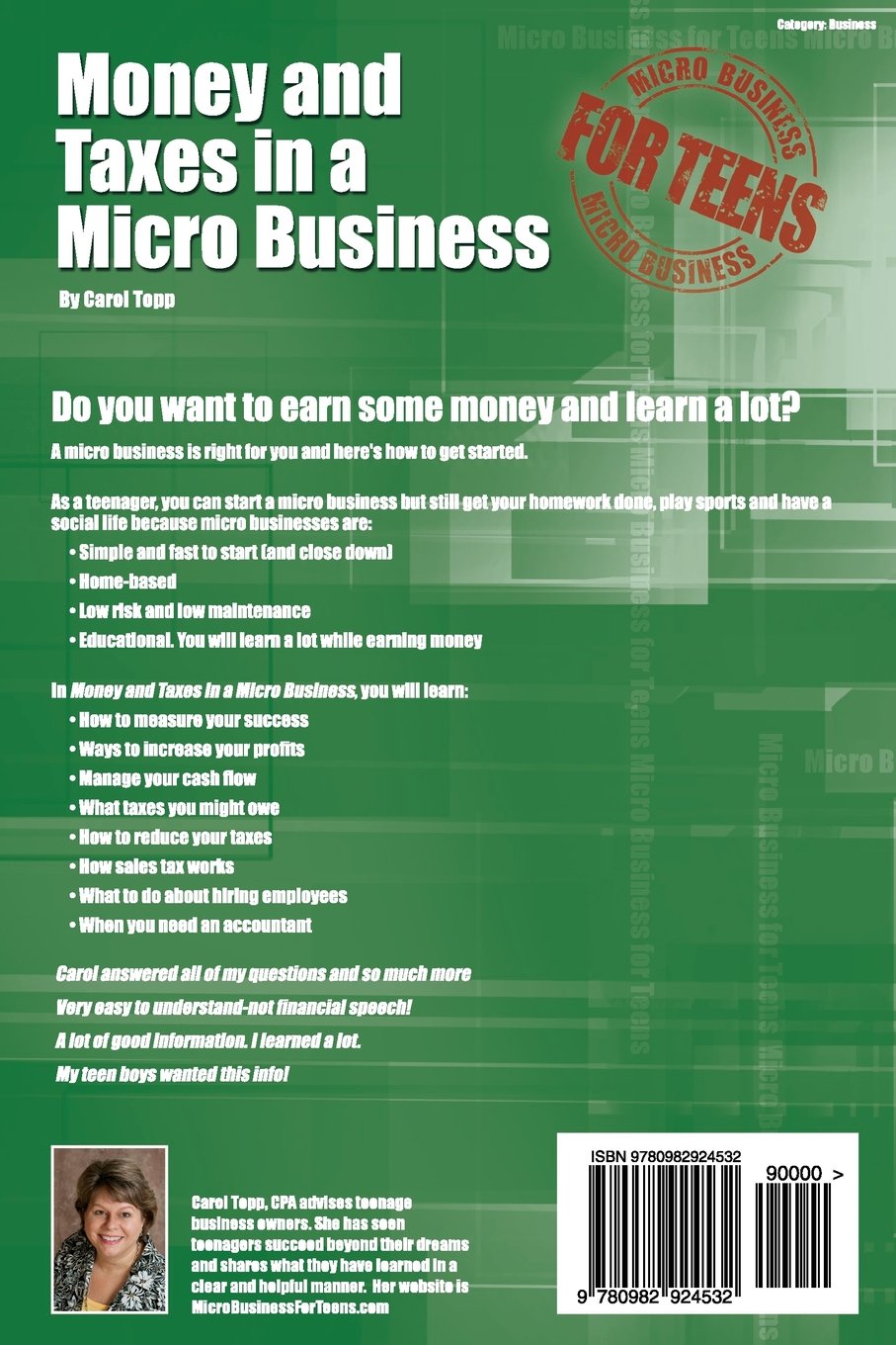 Money and Taxes in a Micro Business is part of the Micro Business for Teens series. In it you will learn -How to measure your success-Ways to increase your profits-Manage your cash flow-What taxes you might owe-How to reduce your taxes-How sales tax works-What to do about hiring employees-How to work with an accountant
